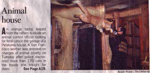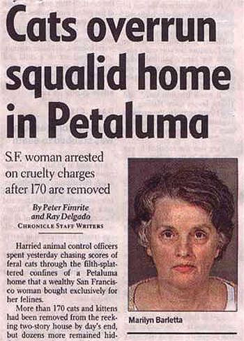 "All of a sudden there were more and more cats," said Marilyn Barletta, who acknowledged moving dozens of cats from a rented house in Bel Marin Keys to the Petaluma address after she ran into legal trouble with her Marin landlord. "It was a population explosion." "I know this sounds bizarre," said Barletta, a 61-year-old retired real estate agent, in an interview outside her Russian Hill apartment in San Francisco. "But I'm a rational person." |